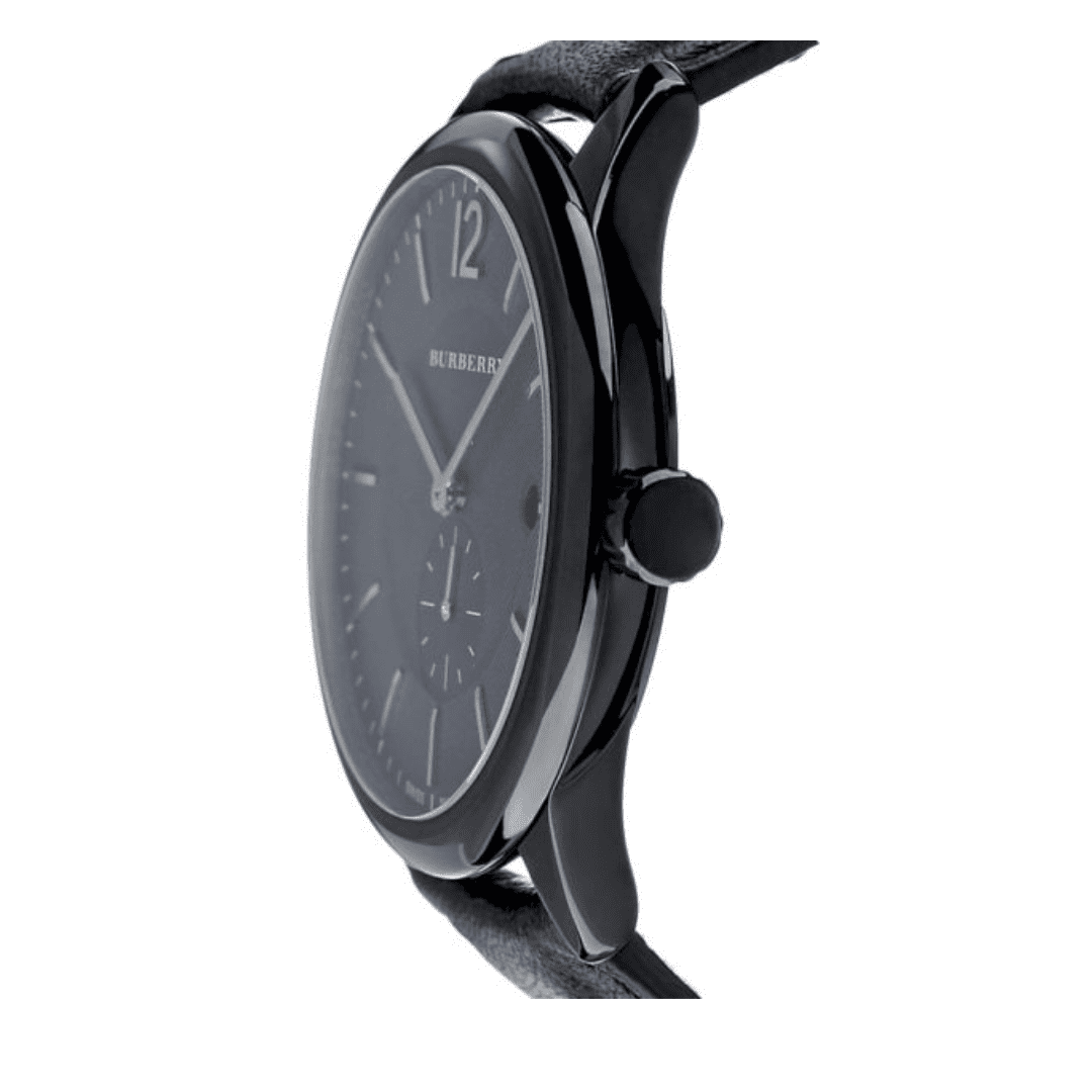 - A perfect blend of timeless elegance, the Burberry BU10003 watch is a classically designed piece that evokes the timelessness of British heritage.The round stainless steel case features a black bezel and dial. This timepiece is complemented by a matching black leather strap and water resistance to 50 meters.