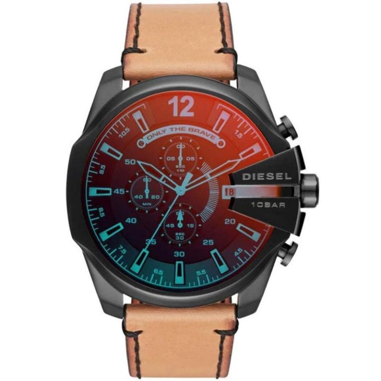 This Diesel Men’s watch features a black iridescent dial with silver toned luminous hands, fixed black tone stainless steel bezel and a stainless steel case with a brown leather strap. Quartz movement with analog display. Round case shape with a 51 mm case diameter. Scratch resistant mineral crystal. Solid case back. Functions: Chronograph, Date, Hour, Minute, Second. Water resistance up to 100 meters.