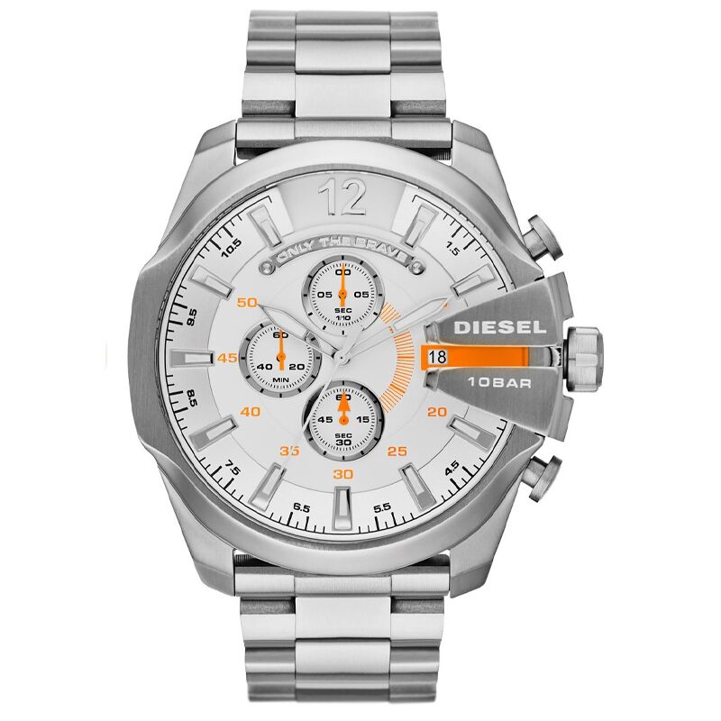 - The Diesel Men’s Chronograph Watch Mega Chief DZ4328 is a bold and versatile timepiece designed for the modern man. Featuring a large 51mm stainless steel case with a polished and brushed finish, this watch stands out with its striking design and robust construction. The fixed stainless steel bezel, engraved with the Diesel logo, complements the solid caseback and ensures durability. The scratch-resistant mineral crystal glass provides excellent protection against everyday wear, while the chronograph quartz movement delivers precision and accuracy, made in Japan for reliable performance.