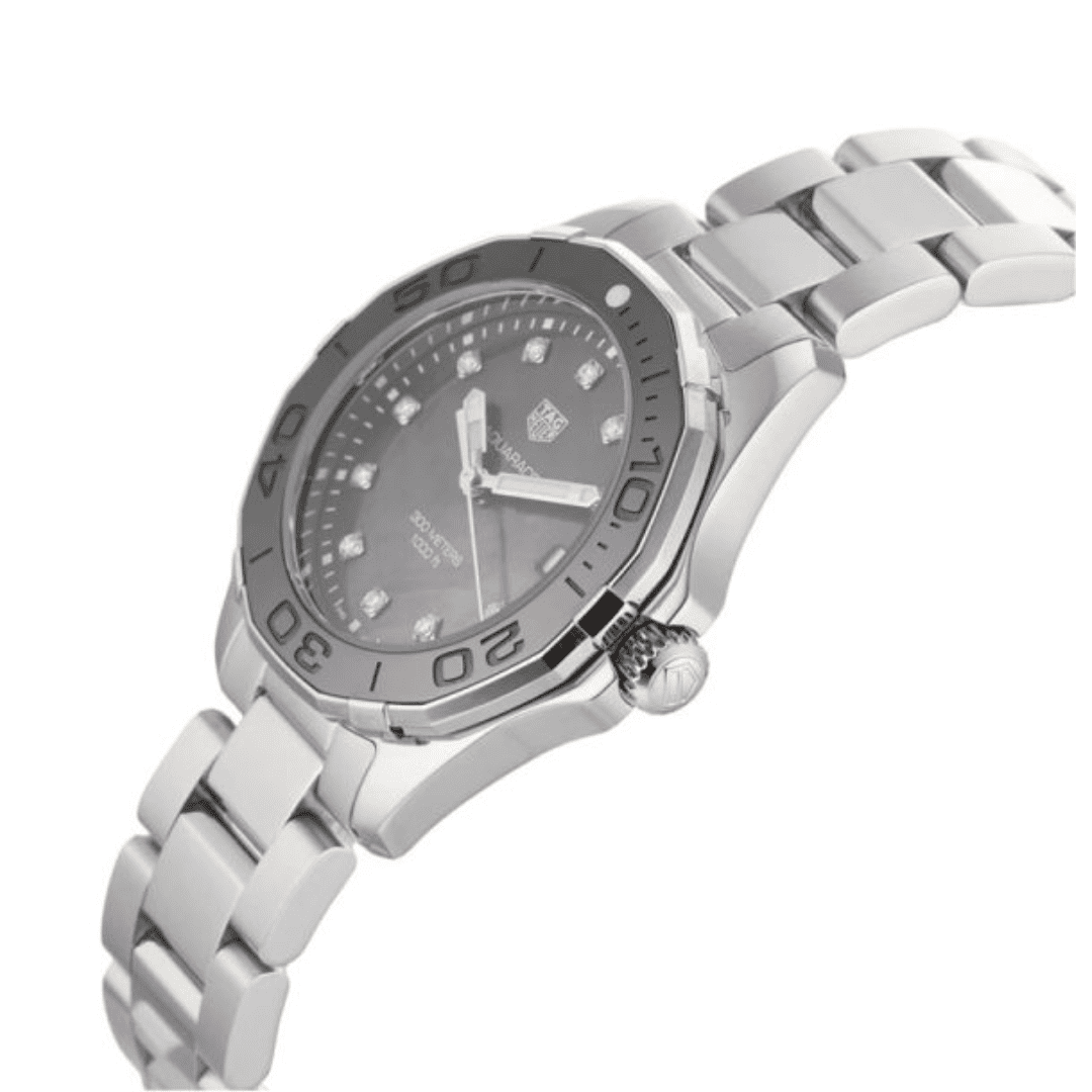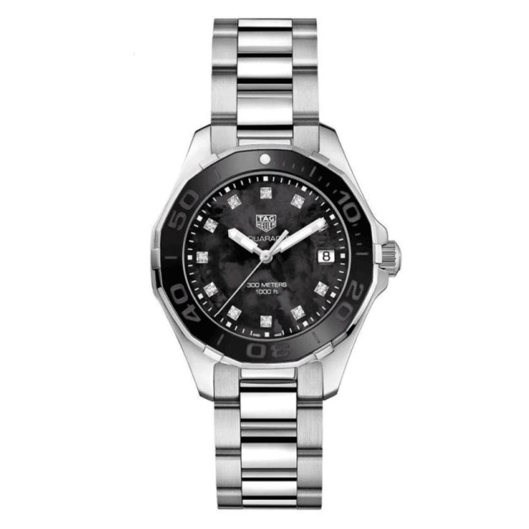 - Tag Heuer Aquaracer Women’s Quartz Swiss Made Silver Stainless Steel Black Mother Of Pearl Dial 35mm Watch WAY131M.BA0748