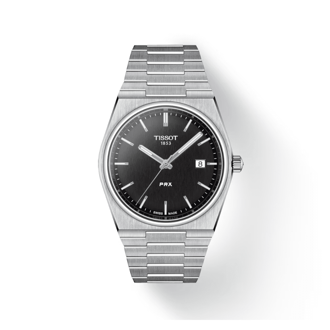 - Tissot T137.410.11.051.00 PRX Men’s Watch. The case is made out of silver stainless steel with a silver bezel, which stands for the high quality of the item, it has a black dial. This model has got 100 meters of water resistance. it can be worn in scenarios where it is likely to be splashed but not immersed in water and will be fine in rain. The watch is shipped with an original box and a guarantee from the manufacturer.